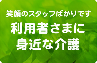 常に利用者様の目線に立ち、利用者様に明るくお過ごしいただける環境づくりを目指しており、笑顔あふれる優しいスタッフばかりです。